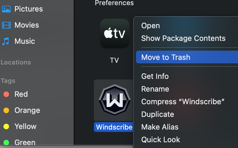 Drag the Windscribe app to the Trash folder on Dock, or select the app and choose File > Move to Trash. You can also right-click the app and select Move to Trash.